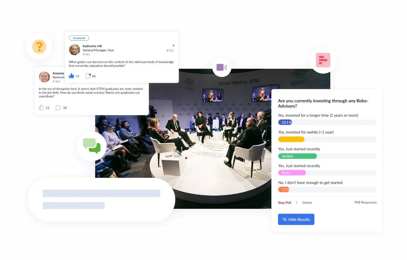 提供管理層所需的工具,讓他們能夠更深入地參與員工。加入互動功能,如投票、問答和聊天,以增強您的會議。