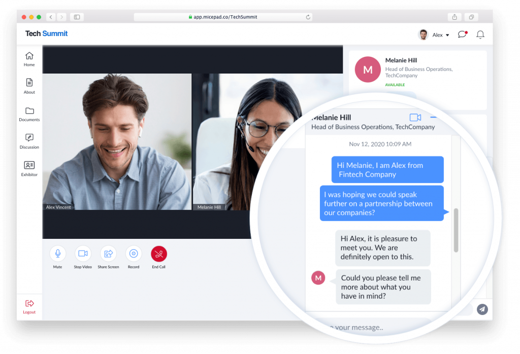 Exhibitor representatives can secure leads by striking a conversation with multiple event attendees simultaneously. Opt between text chat or video call for a more personal connection.