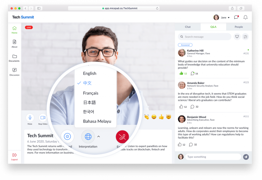 Ready to livestream your event to a multilingual audience? With the click of a button, attendees can useSimultaneous Interpretation to translate audio in real time. Languages include English, Chinese, French, Japanese, Korean, Malay and more.
